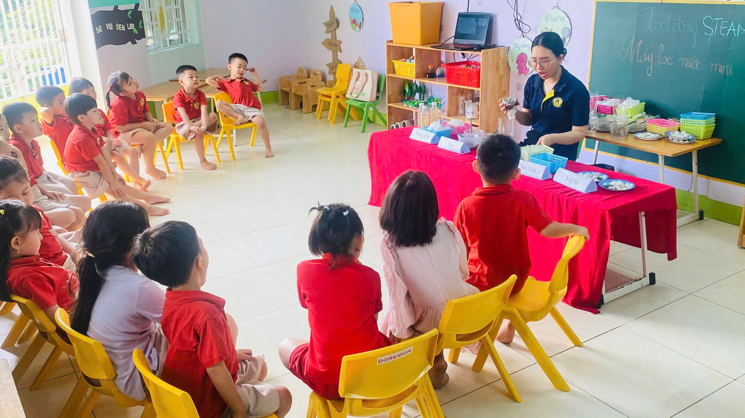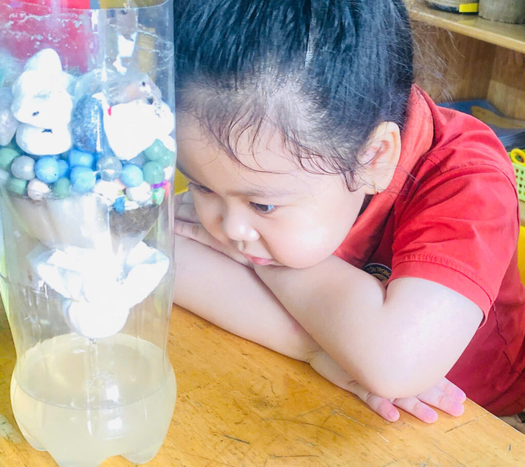 Trong hoạt động này, các bé được quan sát dòng nước đi qua từng lớp vật liệu lọc quen thuộc và dần trở nên trong hơn. Từ việc nhìn thấy nước bẩn, nước đục đến khi nước được lọc lại sạch hơn, trẻ hiểu rằng nước không tự nhiên mà sạch, và con người cần có những cách thông minh để bảo vệ và sử dụng nguồn nước. Thông qua thí nghiệm, các bé làm quen với những khái niệm khoa học đơn giản, học cách quan sát, chờ đợi, dự đoán kết quả và đặt câu hỏi – những kỹ năng nền tảng quan trọng cho tư duy logic và khám phá khoa học sau này.
